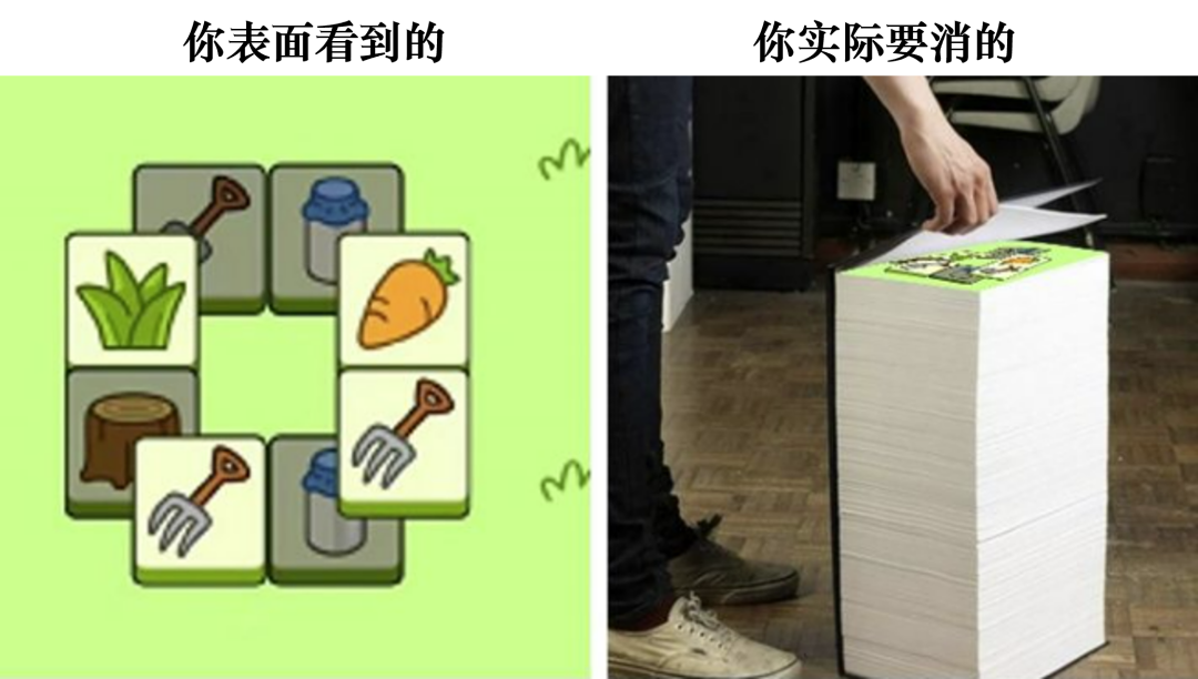 第二關(guān)一共有200張卡片,一般來說有13種類型,假設(shè)第二關(guān)的每張卡片和布局都是隨機(jī)生成的,當(dāng)你玩的越往后,越是會(huì)出現(xiàn)總是三缺一的情況,你能看到的牌,和你槽里的牌,一定是不一樣的。