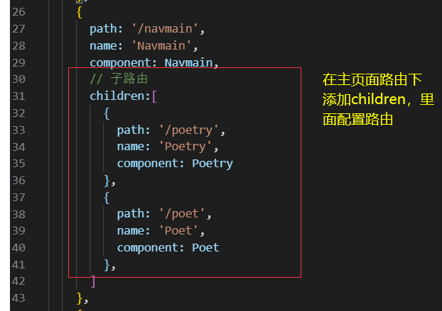 5.在配置好子路由后,就可以在導航菜單欄中使用,使用時只需對index設置需要跳轉(zhuǎn)頁面路徑就行了,如下圖: